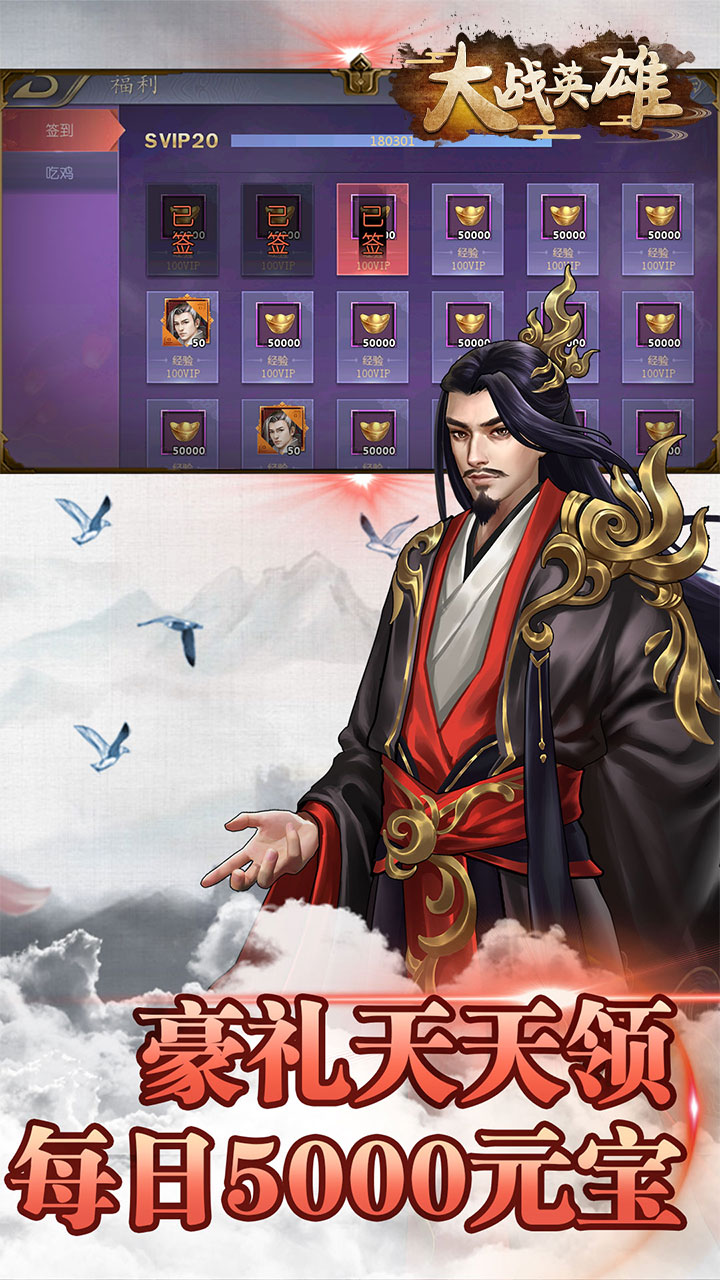《大战英雄》是一款横版回合类的武侠卡牌游戏,该版本汇集众多玩法及福利,保证让玩家爱不释手。独特的代金券系统,上线登录即送代金券,签到还送大量元宝。满V福利直接奖励拿到手软,首冲赠送极品天道侠客,让你横扫前中期毫无压力。完善的跨服系统让你能够与诸多玩家一起纵横江湖,体验刀光剑影下的热血武林。带着自己培养的侠客,一路打上人生巅峰。
